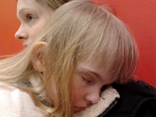Efter att vi hämtat Klara åkte vi ner till Strömpilen och ICA Maxi. Det var en rolig tripp, men ungefär då vi var färdiga och skulle lätta ankar blev Klara jätteledsen. "Ont i pannan", löd symptombilden. Det har ju hänt ett par gånger sedan operationen, och det är ju inte kul. Som några gånger tidigare var ledsen och somnade slutligen, här mot mammas axel, sittande på en träbänk i entrén till Maxi.