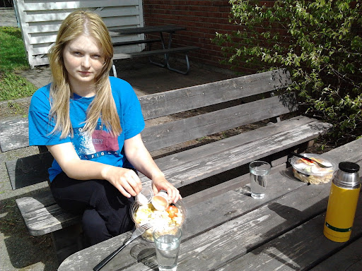 Jag överraskade drottningen med färdig sallad. Hon kontrade med att föreslå att vi skulle inmundiga den ute på gården. Sagt och gjort. En termos fylldes med kaffe och en stund senare satt vi där ute. Hon skulle dock ha tagit en tröja. Inte många plusgrader i norr så här års, och blåste gjorde det. Vi käkade ute, men gick in och drack kaffe.