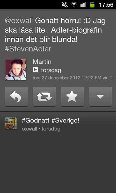 Som ni ser här under har vi även under mellandagarna bollat en hel del med varandra över sociala medier, det är ju så man gör nuförtiden. Inga konstigheter. Inte egentligen. Här pratar vi musik, närmare bestämt Guns N' Roses. Det är tydligt att Martin är väldigt intresserad av musik. Jag tror spontant att han är den där killen som har läst dussintals självgiografier av tidernas mer hårdknackade rockmusiker. Jag är inte alltför beläst, men som ni ser här försöker jag ge ett sken av att jag vet åtminstone litegrann om vad jag pratar om.
