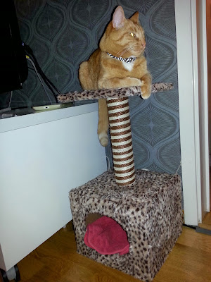 På eftermiddagen var jag iväg och köpte julklappar. Jag fick syn på ett riktigt schysst kattstolpe med både klösträd och en liten mysig koja och dessutom en liten platå högst upp. Detta skulle bli en tidig julklapp till vår allra senaste familjemedlem. Efter Gustafs jobbiga period av rotlöshet är han definitivt förtjänt en liten plats var han kan vara sig själv för en stund. Jag hann knappt skruva ihop ekipaget förrän Gustaf hade gjort sig tillrätta på toppen. Det var som att han visste hur det var tänkt att han skulle ligga. Ingen kan ju direkt påstå att detta inte blev en fenomenal pose.