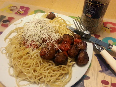 Just ja, middagen. Efter nattning käkade jag resterna från middagen, som för övriga familjemedlemmar inmundigats många timmar tidigare. Nåväl, spagetti med köttbullar och riven ost sitter _aldrig_ fel, och svartpeppar är obligatoriskt.