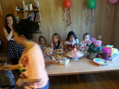 Klockan två gick födelsedagskalaset av stapeln. Det är Klaras kompis Yara som fyllde fem år. Jag börjar kunna det här med barnkalas utan och innan. De börjar undantagslöst klockan 14:00 och barn och föräldrar upplöses lika undantagslöst klockan 16:00, efter precis två timmars stoj och lek. Jag missräknade lite på klockan, eller kanske Klaras framfart på cykeln, för vi kom fram nästan tjugo minuter för tidigt. Jag vet själv hur man ofta sliter med de sista förberedelserna och klarar deadline precis på håret, så att komma så tidig är osedligt. Därför stannade vi ute i parken på gården och inväntande klockan. När klockan är precis på minuten ser jag hur en annan förälder går in med sitt barn i porten dit vi ska. Vi hakar på och hinner med innan porten slås igen. På så vis anländer vi liksom i samlad trupp.