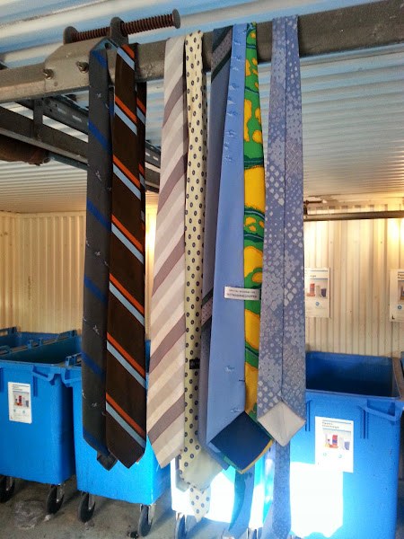 På eftermiddagen köpte vi chokladsås och sedan käkade vi glass. Sedan mumsades det. Senare framåt kvällen när jag gick ut med soporna fick jag plötsligt medvind. När jag kommer in i miljöhuset har någon hängt upp en massa slipsar. Wow. Jag äger i princip bara en slips, och i dagsläget klarar jag inte ens av att knyta en slipsknut själv. När jag stängde dörren till miljöhuset bakom mig var jag plötsligt ägare av ett tiotal slipsar. Just sådana här torsdagar gör livet lite extra värt att leva.