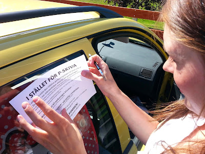 i åkte in till stan och Coop Forum för att hitta nån uppfriskning. Nu blev vi varse systemet med P-skiva nyttjas i princip överallt i denna stad, i motsats till hemma var det istället kostar en massa pengar. Nu hade vi ingen P-skiva, men lyckligtvis fanns det en liten blankett på Coop Forums parkering. Någon penan hade vi inte heller. Ingrid agerade fiffig och plockade fram en kajalpenna. Alla problem har lösningar.